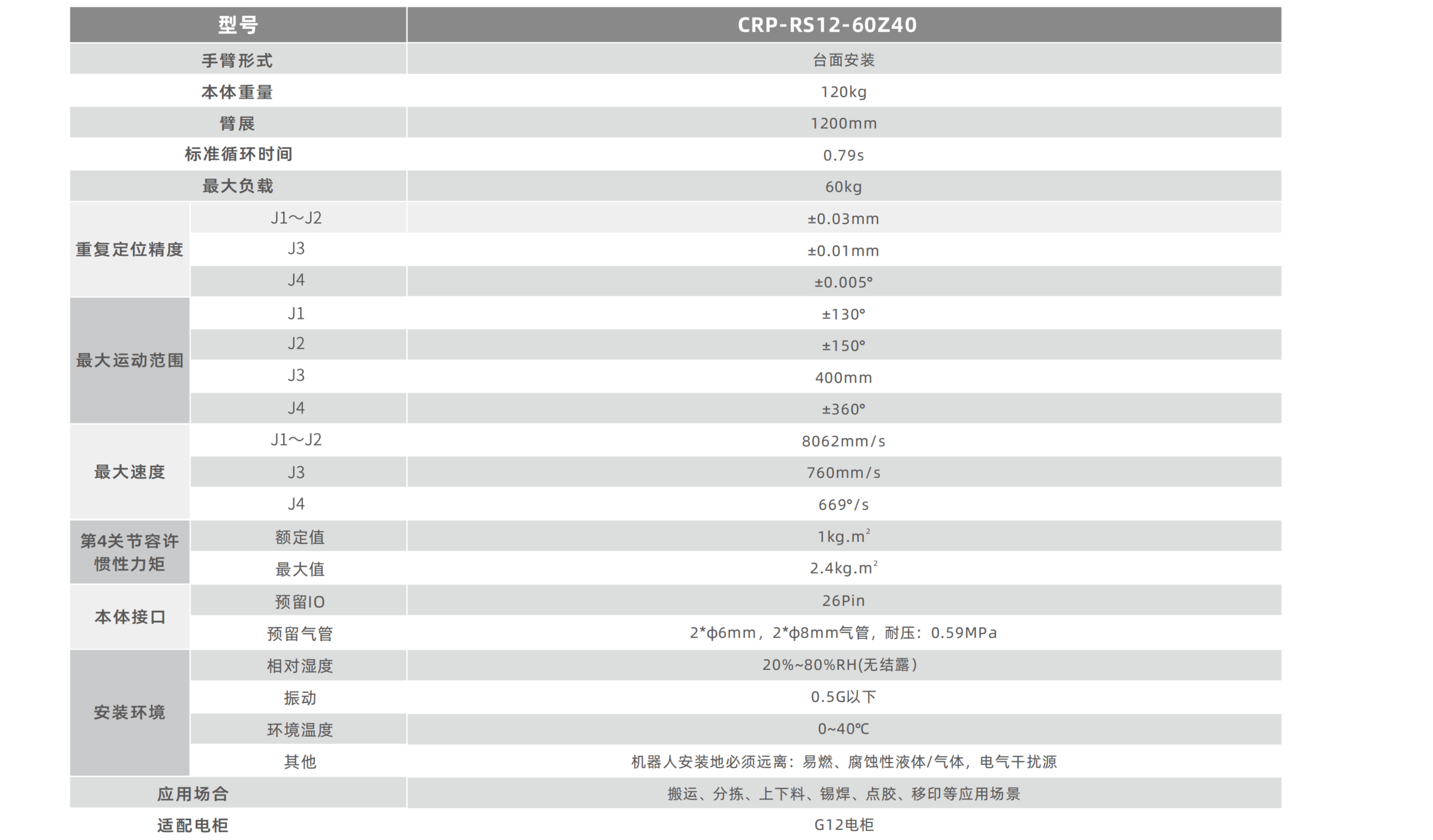 ? 機器人最大負(fù)載可達60kg,臂展可達1200mm,Z軸有效行程可滿足400mm。